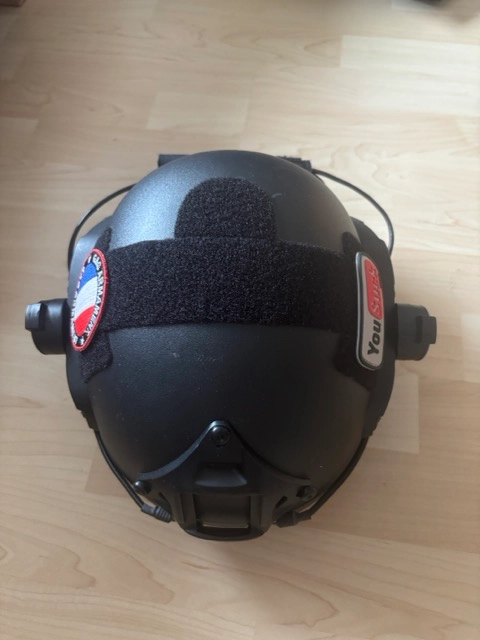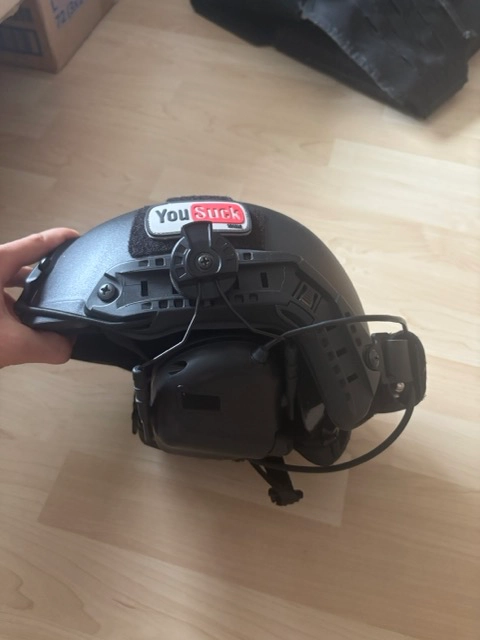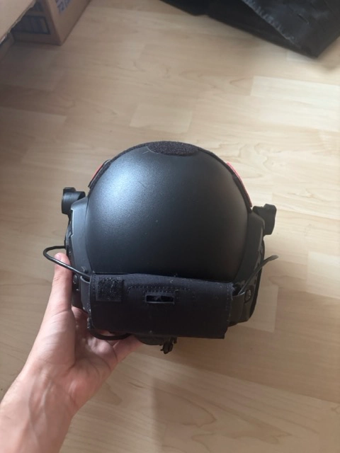 Je vends ce casque Emerson Fast PJ équipé avec les oreillettes EARMOR M32H déjà monté sur les rails du casque. Une pochette pour ranger le cable est également positionnée à l'arrière du casque.