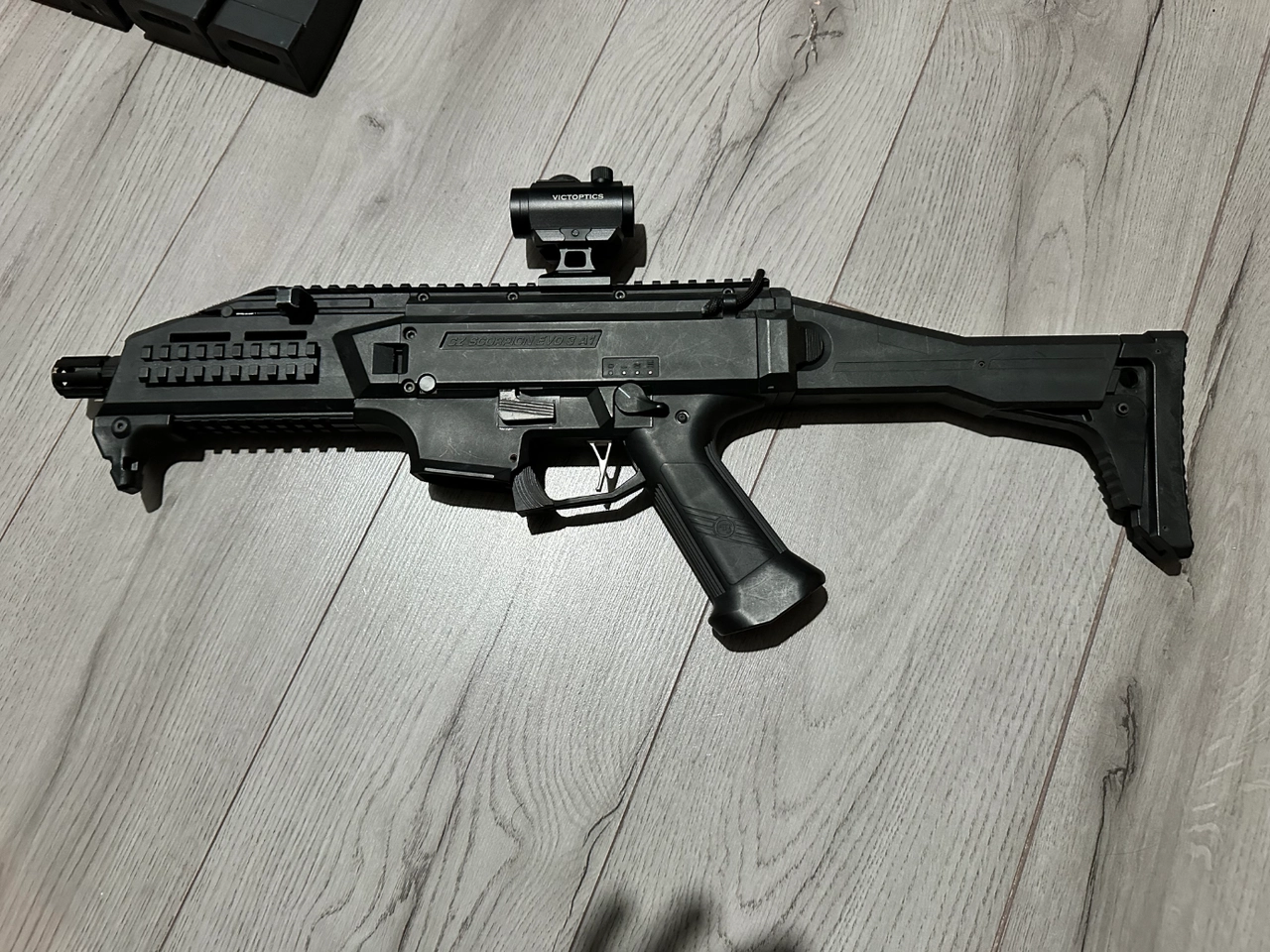 Vend cz scorpion evo 3 tres bon etat (400€) avec detente cnc (40€), red dot (20€), 5 chargeurs mid cap ( 125€), 2 chargeur hi cap (75€) avec batterie, anpeq factice pour la grosse batterie et ressort pour cqb