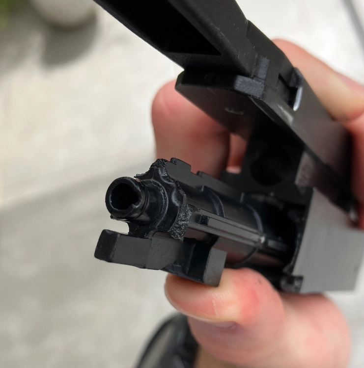-> Nozzle abîmé donc mauvais kickage des billes (nécessaire d'en mettre un neuf si partie airsoft sinon correct pour tir sur cible)