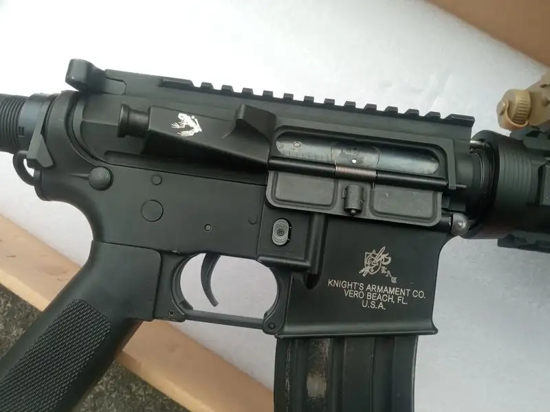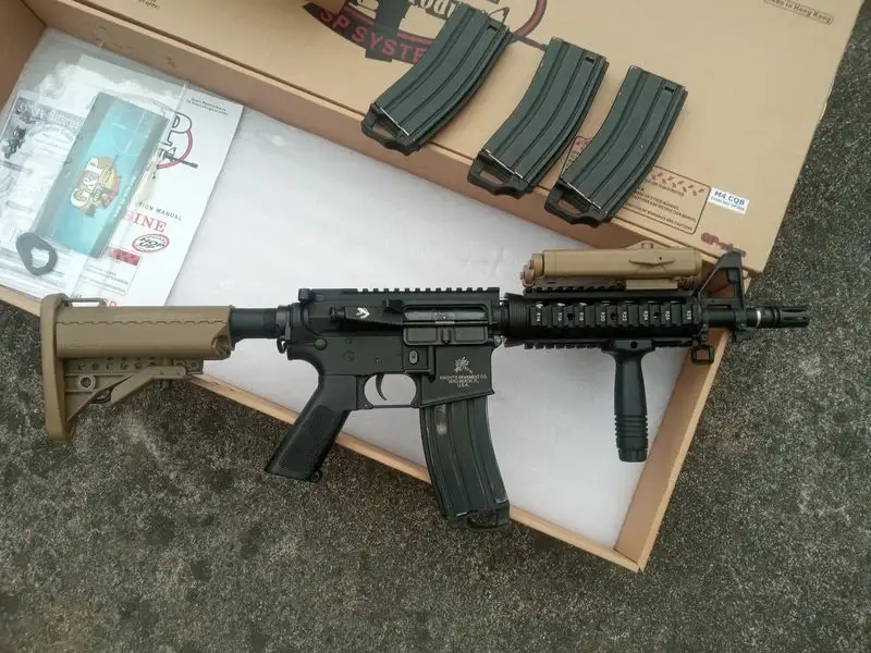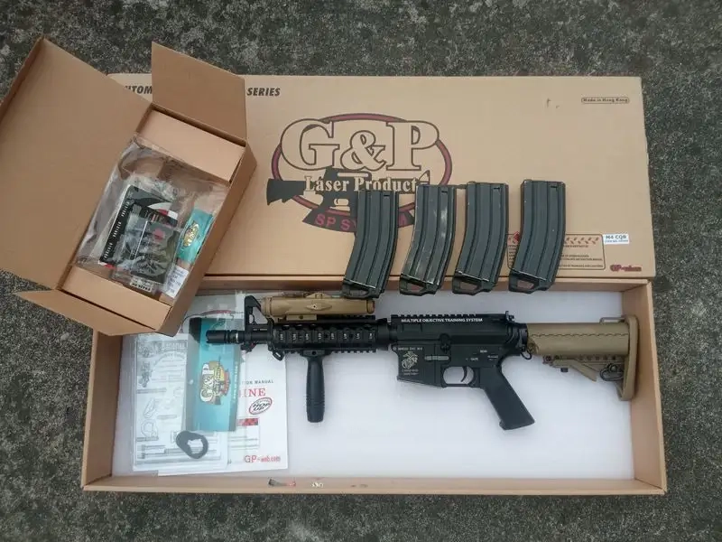 Fonctionne parfaitement. La réplique sera fournie avec sa boîte, 4 chargeurs mid-cap G&P avec le magwell vissé, une poignée verticale G&P, un boîtier Peq-2 vide de marque Element et le end-plate G&P d'origine. Câblage en T-Dean dans le tube de crosse. Le mag-catch est ambidextre et il y a un gros latch carré sur le levier d'armement.