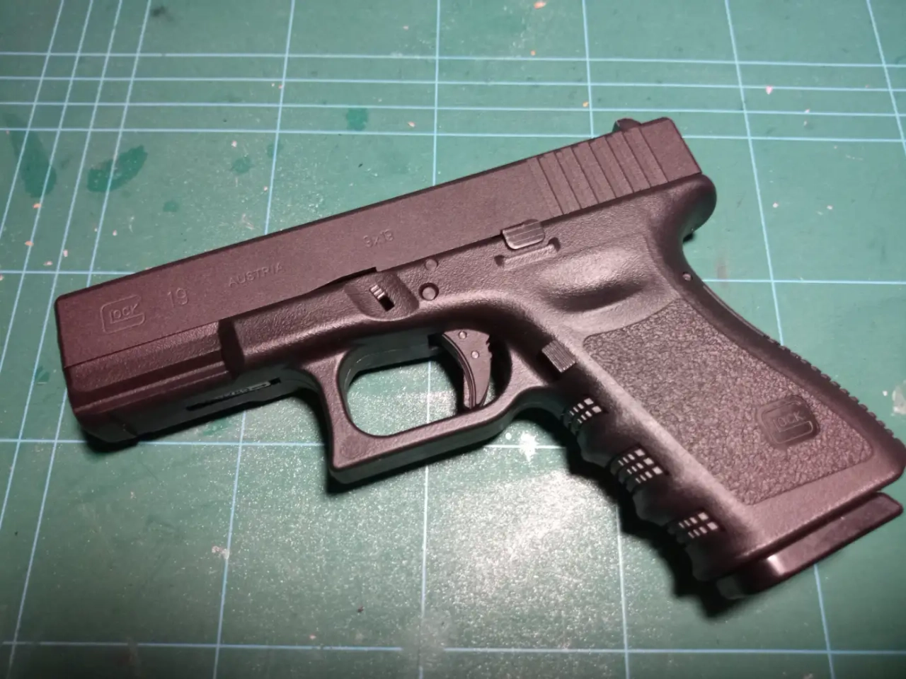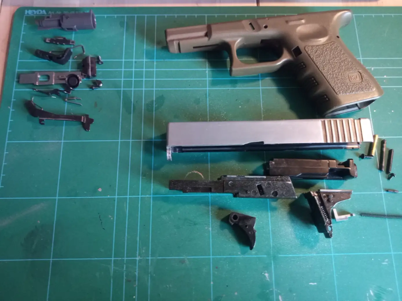 Il y a une culasse Glock 19 avec marquages, une frame Gen 3 type Euro, un bloc marteau complet en acier, un châssis acier, un BBH 20g, etc.