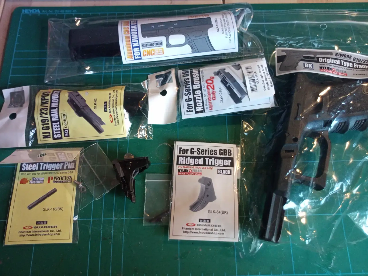 Glock 19 KJW en très bon état, avec 3 chargeurs sans fuite, ainsi qu'un gros lot de pièces Guarder pour le kitter en Glock 19 normal avec marquages.