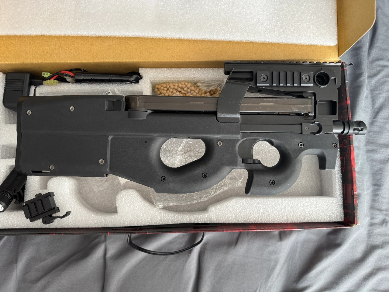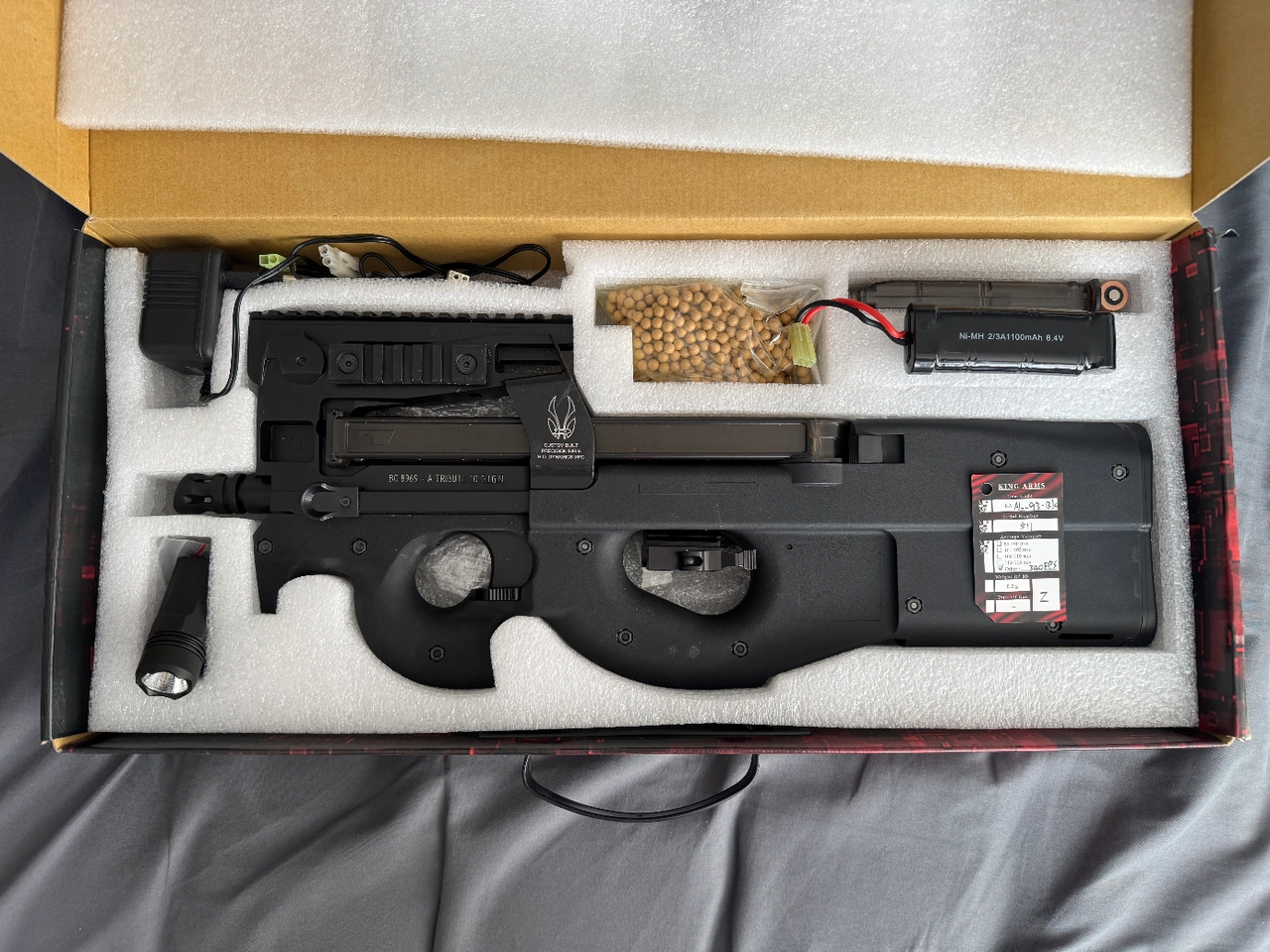 Airsoft King Arms P90 Neuf + accessoires La boite est légèrement enfoncée mais tout le contenu est nickel, jamais servi.