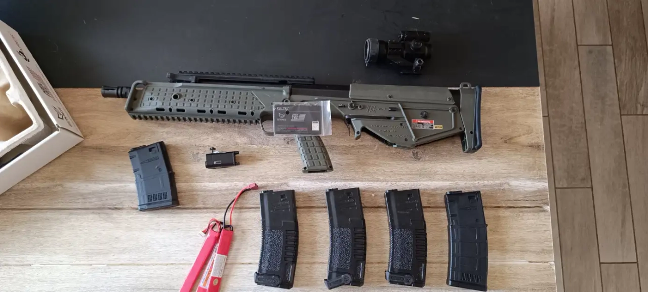 equipé d'une lampe, lunette Acog, batterie lipo 11.1 25c, 1 mag low cap, 3 mag hight, carton d'origine et bonne état.