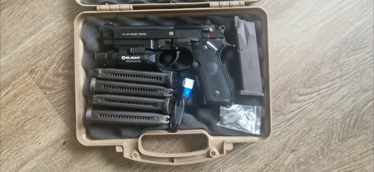 1 lots complet de UMAREX/KWA M9A1 Gbb + 1 lampe 1350 lumens / laser vert BALDR PRO R + 5 chargeurs + un holster pour M9A1 et BALDR PRO R avec fixation Safariland + Boîte de transport plastique Nuprol et boîtes originales.