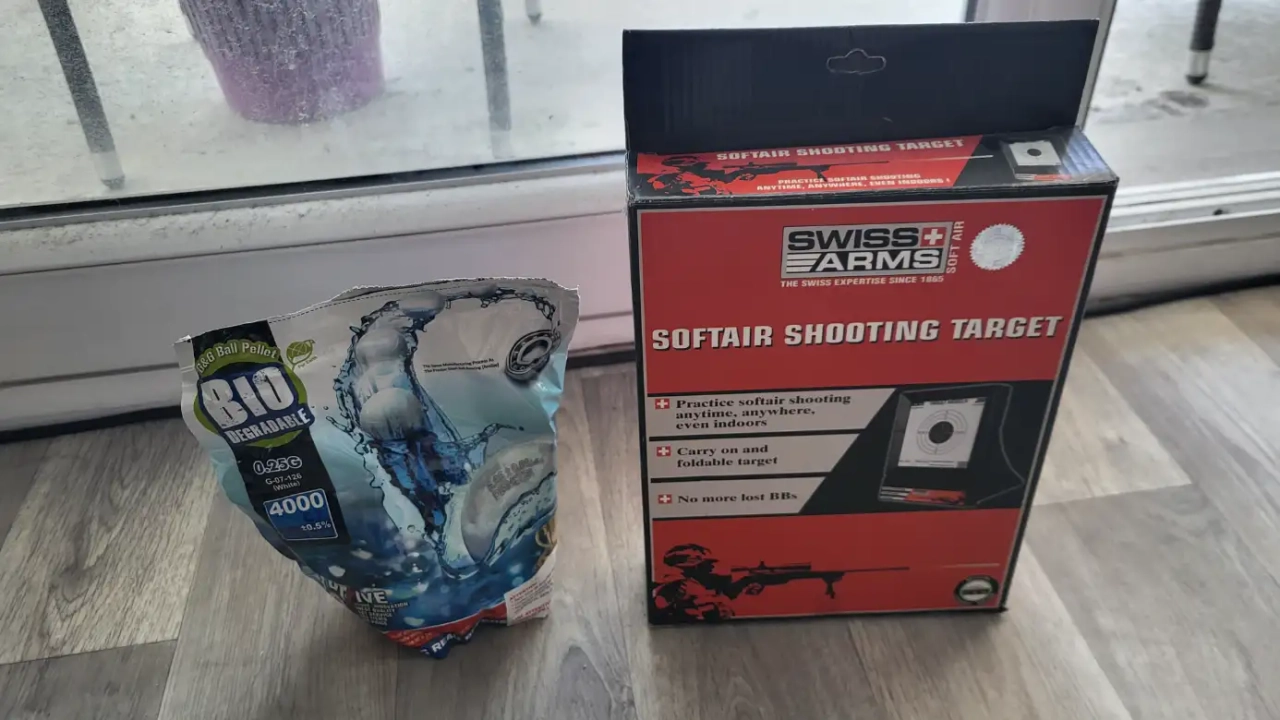 La replique a un bipieds intégré, vendu avec une poignée, le chargeur de batterie, la batterie, un sachet de billes et une petite cible.