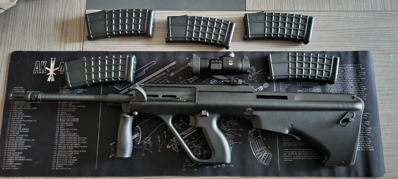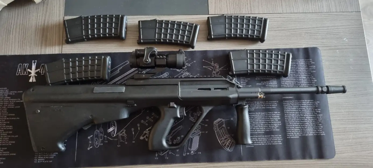 Il s'agit donc d'un AUG GHK fournit avec 5 chargeurs sans fuite, la réplique à 4 parties à son actif, seuls quelques traces sur le canon et sur le bouton de démontage son visible extérieurement.
