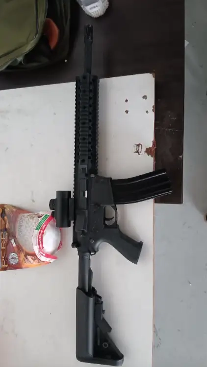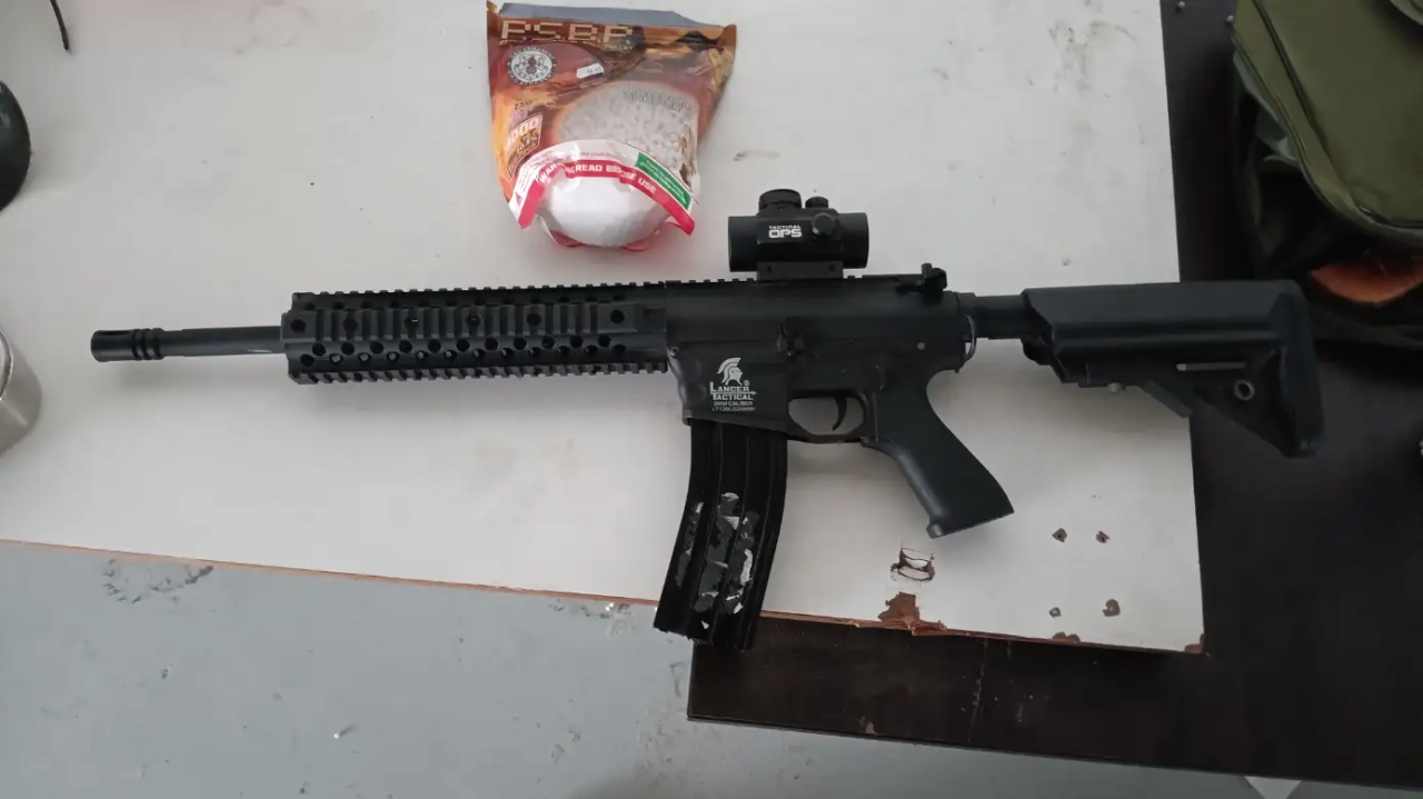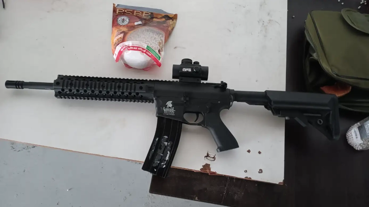 M4A1 Lancer tactical, seulement deux parties jouer et équiper d'un viseur point rouge à optique laser sortie de boîte, batterie chargeur, un sac de bille avec 3700 bille et un chargeur de 300bille inclus dans l'offre.