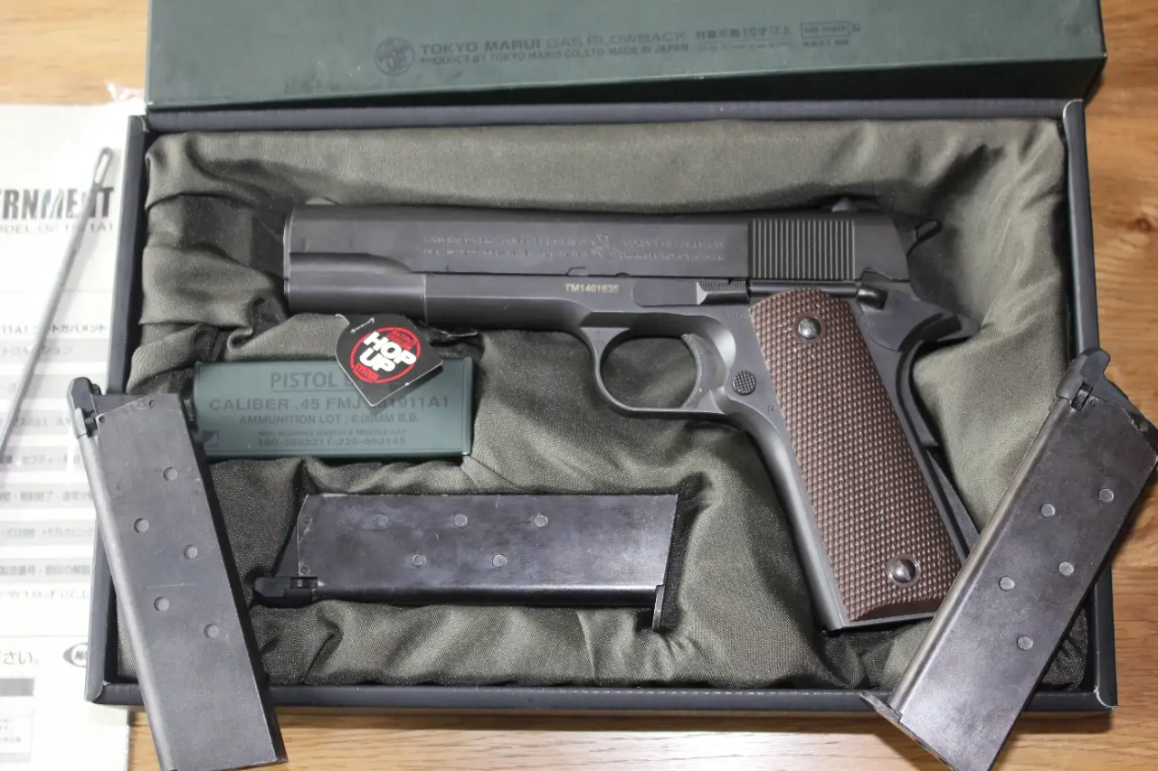 Réplique du Colt 1911governement de Tokyo Marui dans sa boite d'origine avec le manuel, tige de débourrage.