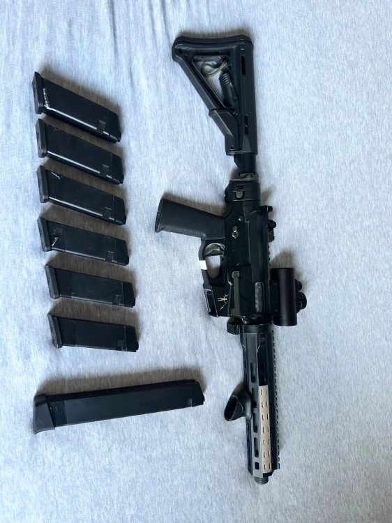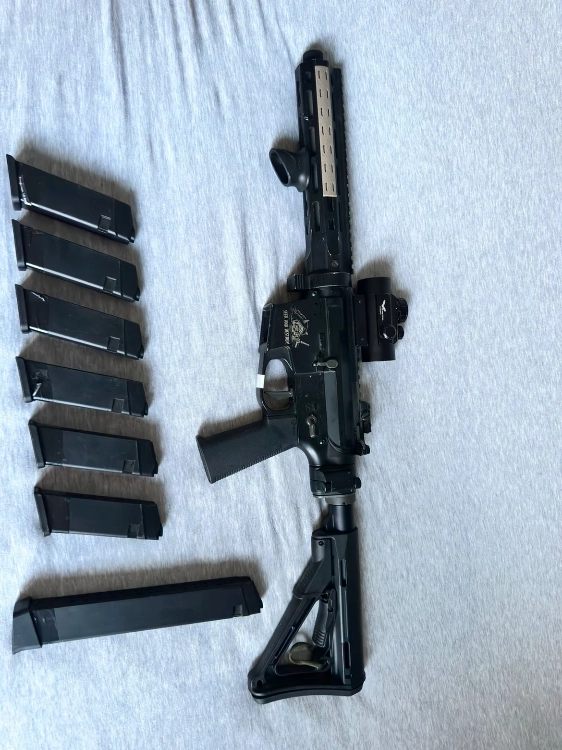 Réplique m45 marqué: ares full métal cross ctr poignée slim gravure perso poigne moe perso joint hop-up mapple leaf viseur inclu 7 chargeur dont un long donc un autre garde main interchangeable court en ris avec cannon et bloc hop-up indépendant