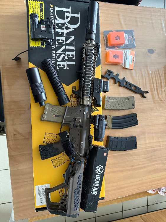 Mk18 ics équipé d’un bloc hop up max model ics et joint hop up 4UANTUM, un canon de précision 6,01 modify tous l’interne est du master mods ainsi qu’une gear box split ics ,tappet plates renforcer et détente max model, cylindre max model,je le fournis avec la batterie 11.1v une silencieux pts ainsi que les les organe de visée vector optic. Je donne également avec une tête de piston et tête de cylindre max model neuf encore emballer le tout fournie avec une malette.
