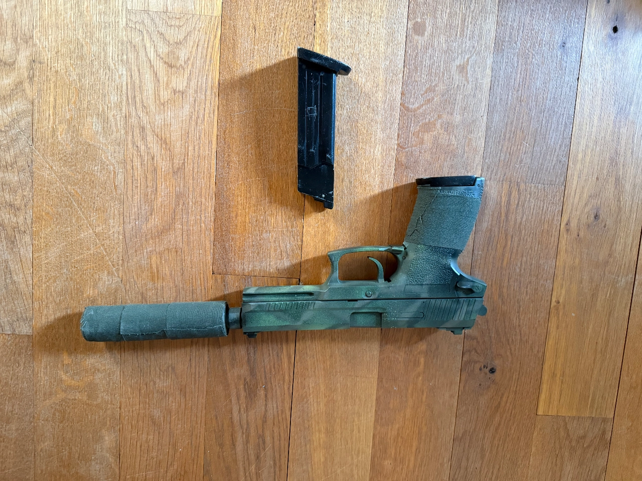 Peinture faite dessus, silencieux changé, canon modifié pour un plus long.