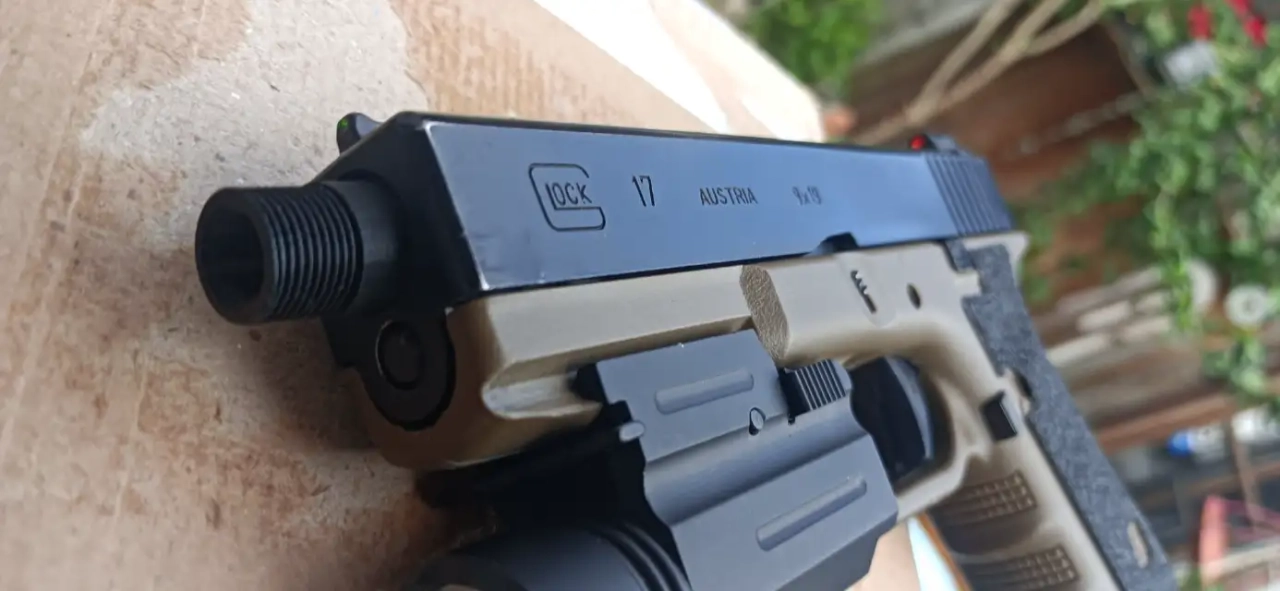 Culasse en métal, organes de visée en fibre optique rouge & verte, canon fileté, lampe tactique, grips anti-dérapent & anti-transpiration.
