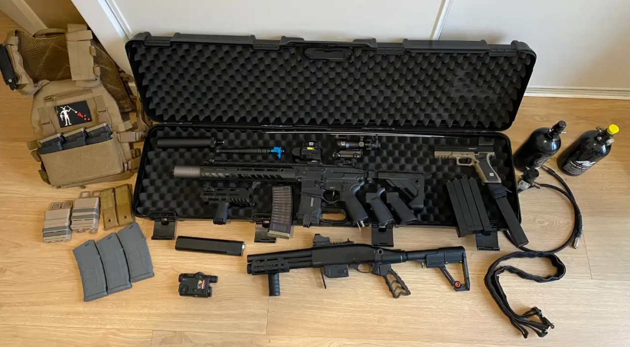 - Fusil à pompe x3 billes custom avec valve HPA (je possède la valve d'origine pour le repasser en gaz) + red dot + adaptateur chargeur M4 + poignée > 100 EUR.