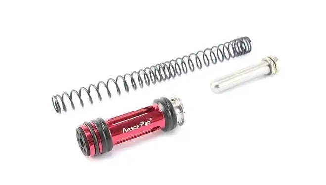 Kit d'upgrade pour fusil sniper Ares Amoeba Striker. Piston CNC ultra-léger, guide ressort inox avec roulement, ressort. Performance garantie.