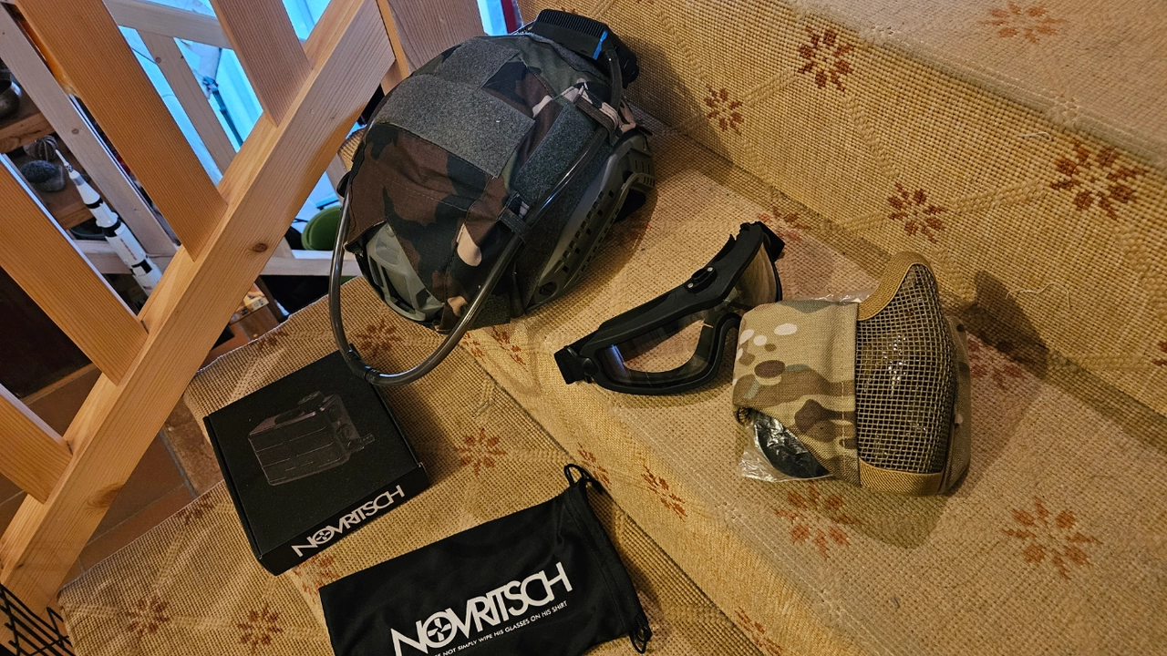 À vendre cet ensemble de protection avec casque, camo tissu en velcro, face nez etc, et lunette et système de ventilation anti buée de NOVRITSCH (anti fog unit), le seul qui marche vraiment sans aucun soucis.