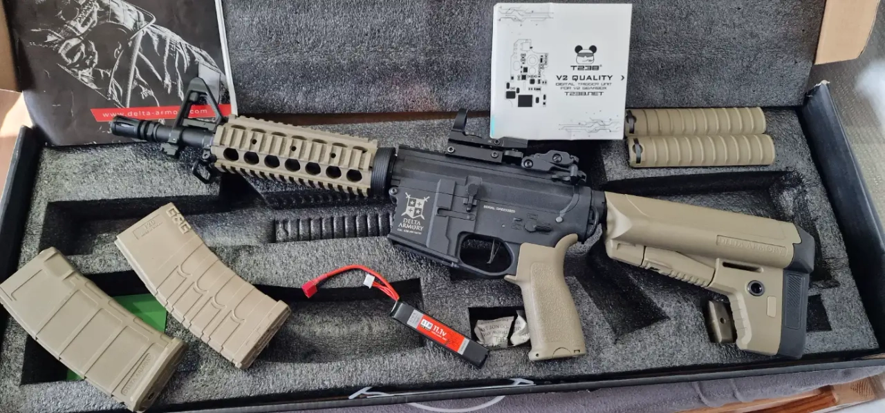 Bonjour je mets en vente cette réplique M4 de la marque Delta Armory améliorée avec un mosfet programmable T238.