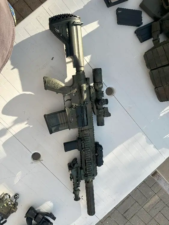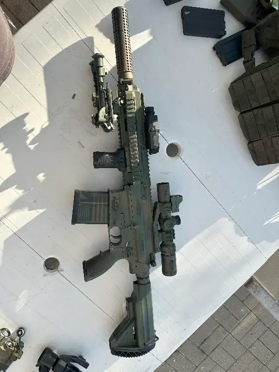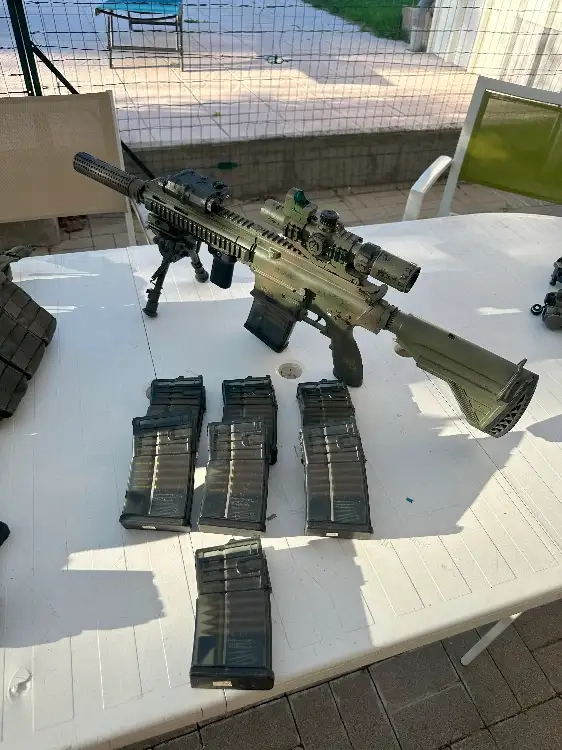 En externe on y retrouve une LPVO x1.5-4, un boitier peq laser/lampe, un mini red dot au dessus de la lpvo, un silencieux et une poignée avant