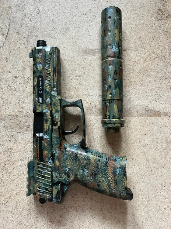 Le premier est un ASG. Peinture camo perso, silencieux rallonge de canon (cela amplifie réellement la puissance), rail picatinny posé pour y fixer un RMR, joint Maple Leaf vert 50°.