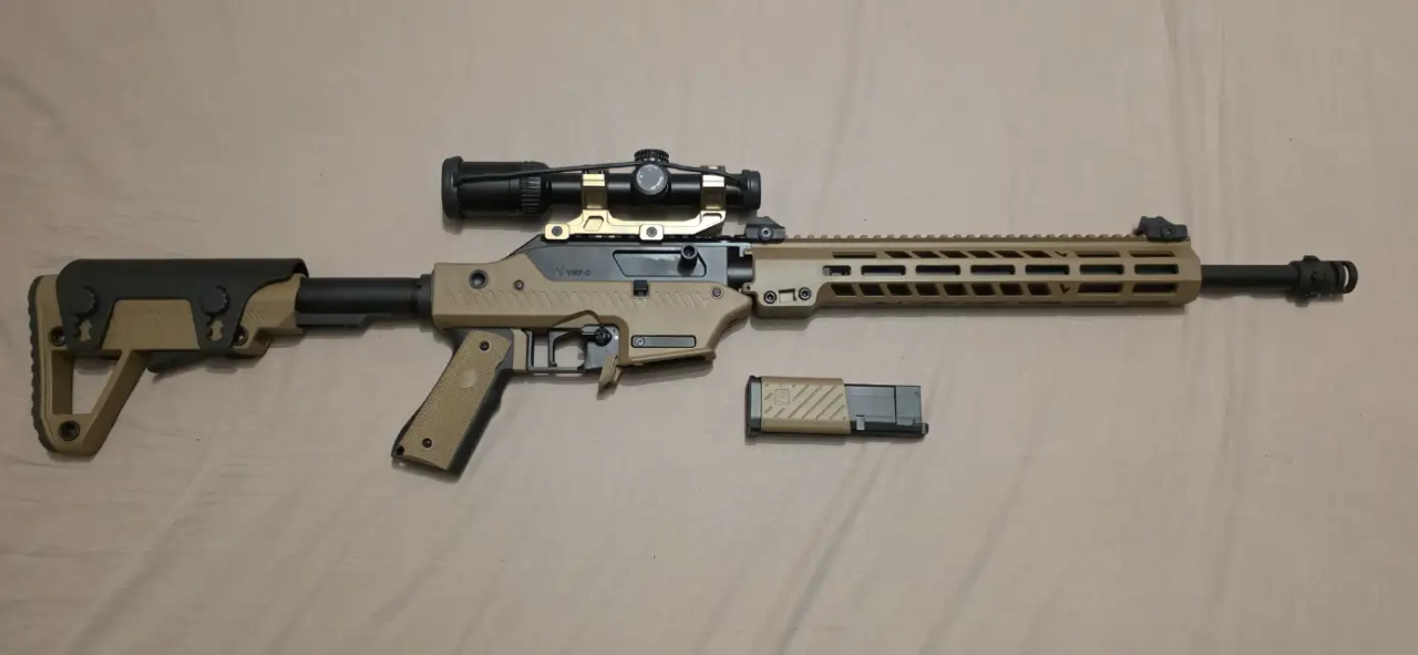 Vendu dans sa boite d’origine avec son chargeur court, une lunette 1-4x20 Vector Optics (70€), le patch fourni avec ainsi qu’un nozzle 450 fps que je n’ai pas pris le temps de monter dessus.