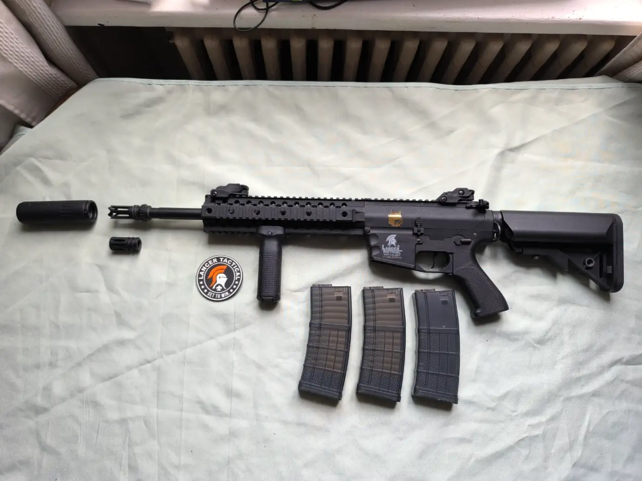 Vendu avec 2 batteries lipo 11.1, le réducteur de son escamotable, le frein de bouche d'origine, la poignée, 3 chargeurs hi-cap.