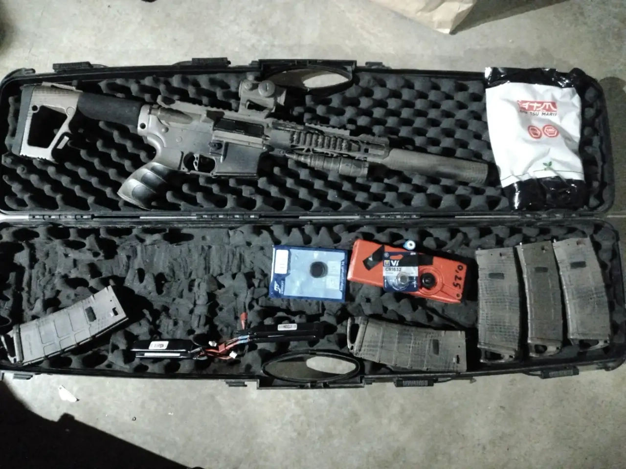 Dans le lot est également compris un 1 chest-rig avec porte chargeurs type M4 (x5) et P.A, 1 sac a dos pour poche d'hydratation ou bouteille HPA, 1 holster avec platine, 1 poche rigide pour radio Baofeng, 1 ceinture tactique, 1 dump pouch, 1 sangle réplique longue, 1 casque Fast (taille M).