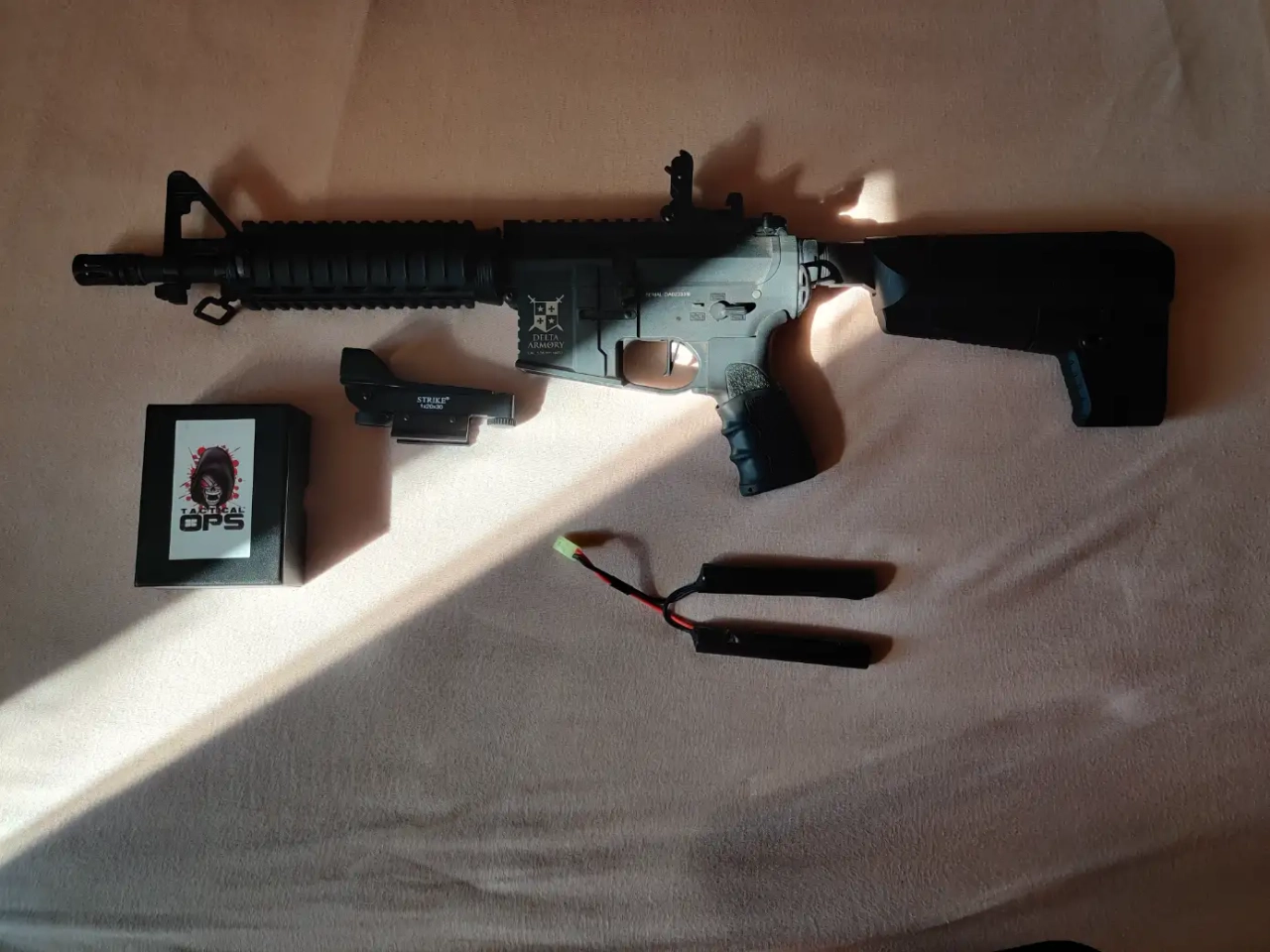 Je vends une Réplique M4, acheté en Juillet 2024, avec un chargeur, une batterie (sans le chargeur), et un viseur laser de marque Tactical OPS.