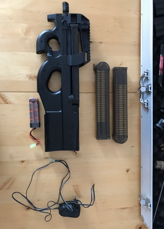 Il est vendu avec trois magasins (le troisième n’est pas présent sur la photo), sa batterie et son chargeur.