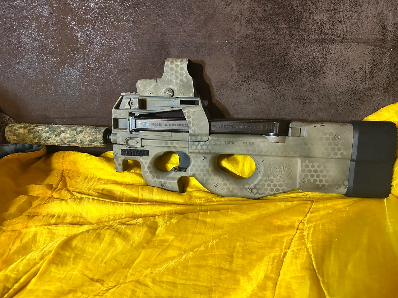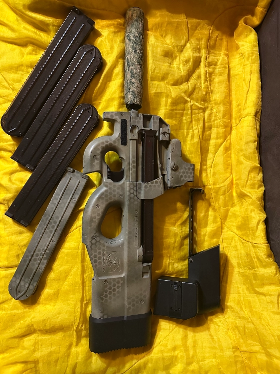 P90 cybergun upgradé high torque moteur et engrenages + mosfet perun, canon de précision et joint hopup. C'est tres rapide et nerveux.