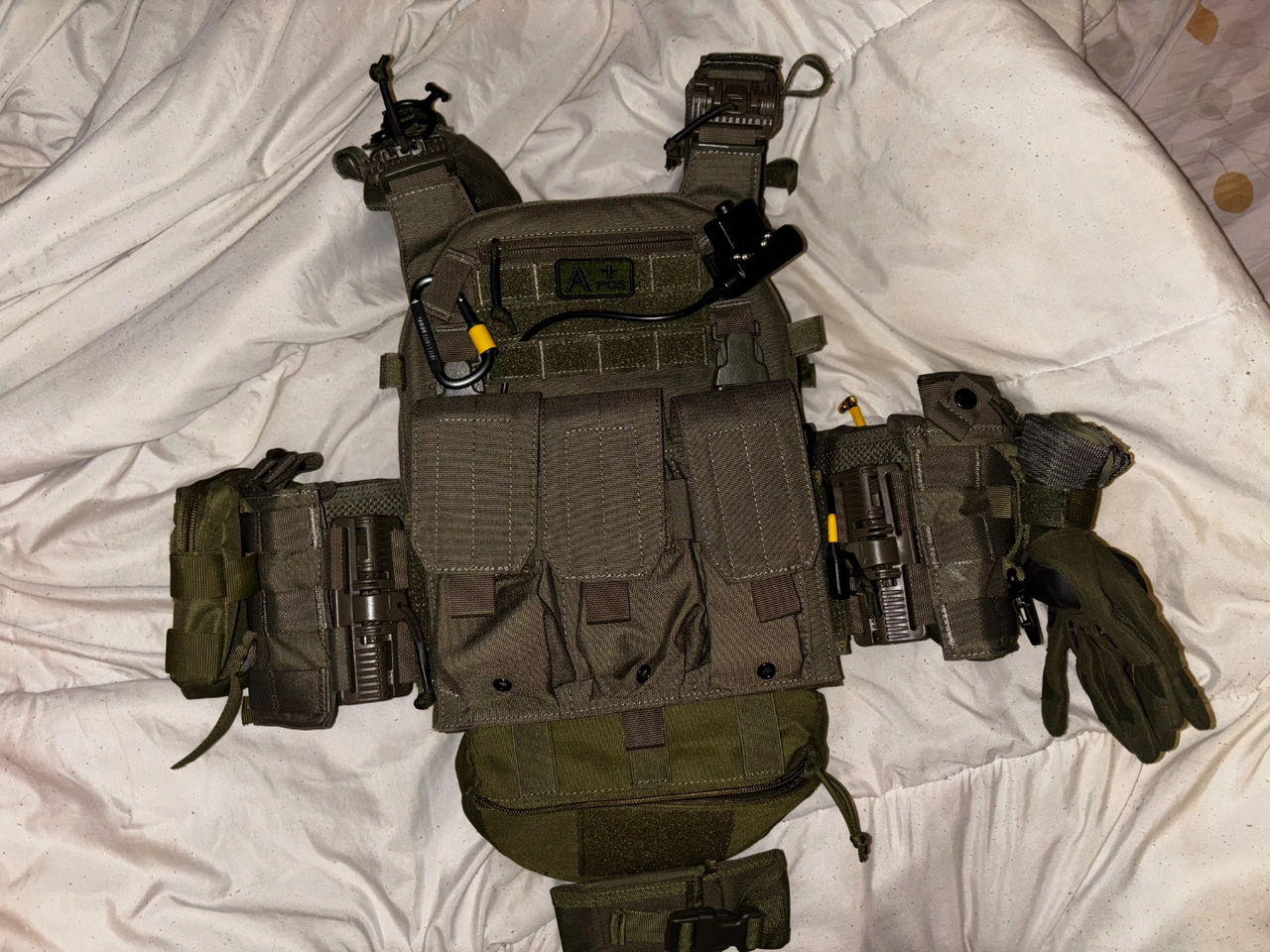 Comme vous le voyez sur la photo je le vends avec une paire de gants à coque, porte chargeurs, poche radio, attache gants, poche médicale, poche ventrale, mousqueton, système PTT pour radio et antenne deportée.