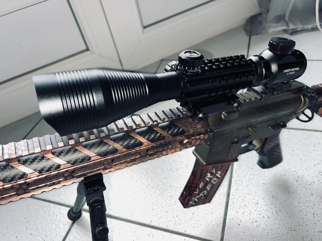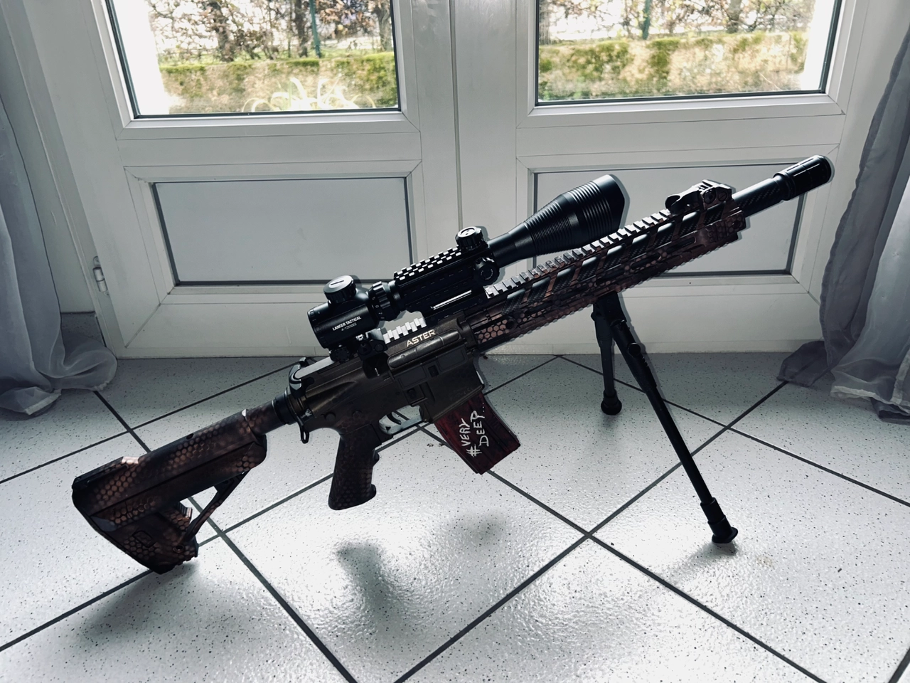 Canon externe recouvert d’un tube carbon plus un amplificateur en bout de canon et une crosse QRS signé VFC