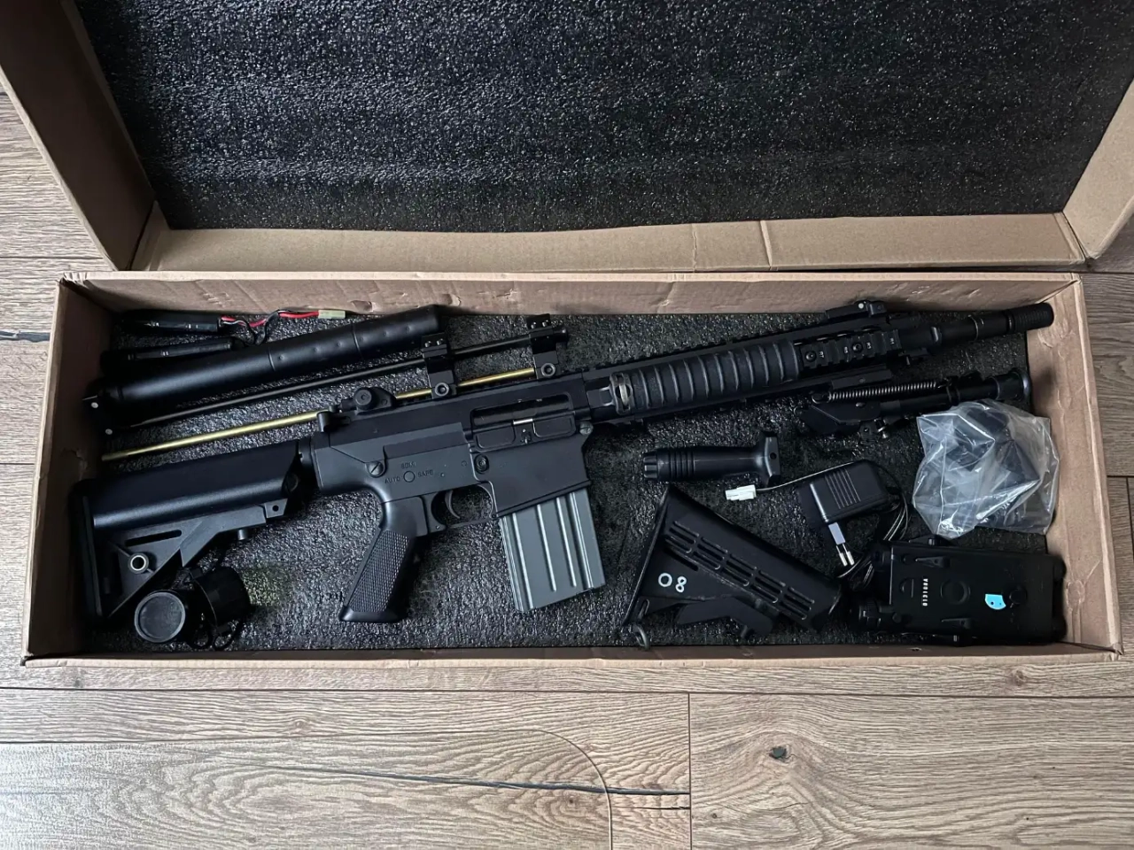 A&K SR-25 K avec les accessoires : crosse crane + style colt, bipod src,anpeq2 batterybox, batterie,montage lunette,rails cover Knight armament RD,silencieux,grip…