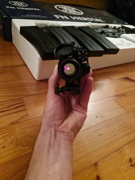 La boîte comprend la replique, 4 chargeurs, une aide à la viser, une sangle, le chargeur de batterie et la batterie.