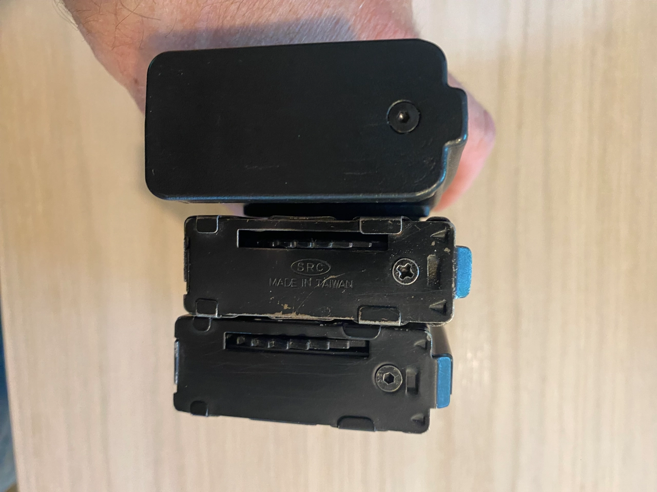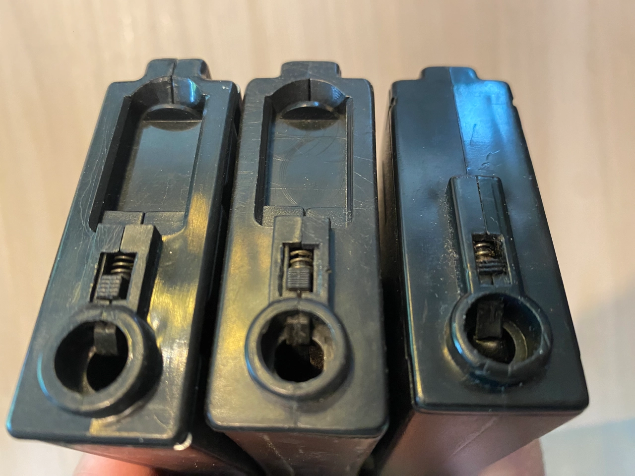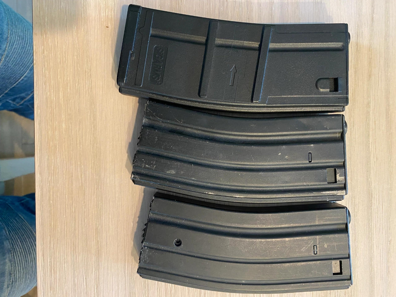 3 chargeurs type M4 ou M16 ou Ar15, 1 en plastique, quasi neuf, capacité inconnue mais je pense un Midcap, 2 chargeurs en métal noir, usagés mais fonctionnels, Hicap.