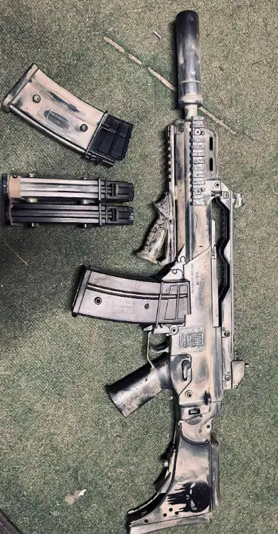 Cette SA-G12V a reçu un camouflage custom type “battleworn” avec logo Punisher (peinture réalisée à la bombe et vernie), ce qui la rend vraiment unique sur le terrain.