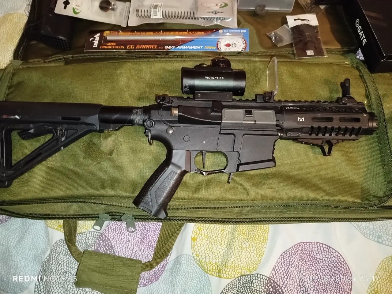 Fourni avec 3 chargeurs ,une crosse avec rallonge,une longue Lipo 11,1 , point rouge Vector optique, poignée incliné , traceur ect..