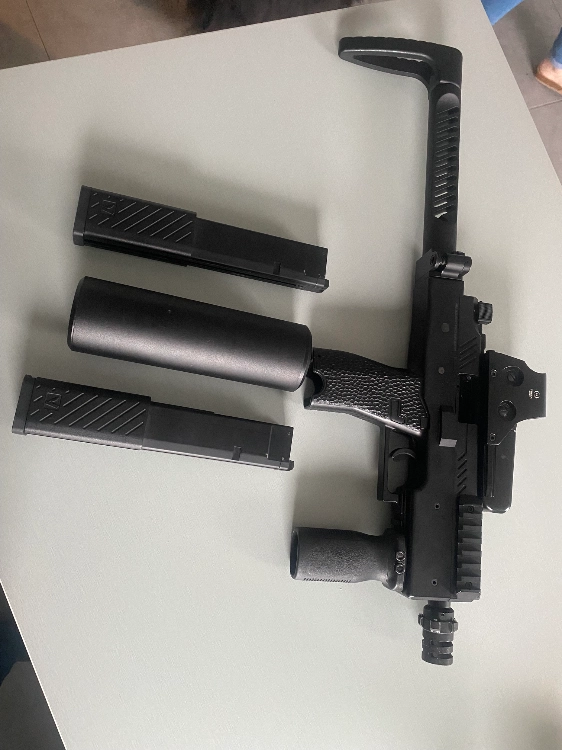 Avec la boîte d’origine, le silencieux, deux chargeurs, poignée, et viseur.