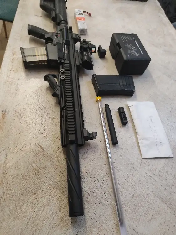 Je vends un superbe HK417 Marui NGRS (AEG avec effet de recul), avec pas mal d'upgrade. Il y a un canon long de précision, intégré dans le silencieux, un ressort m100 garder qui permet d'être a 1,34 j en 0,32g, piston et tête de piston renforcé, engrenage renforcé, mosfet titan, hop up mappleleaf ... bref la crème .