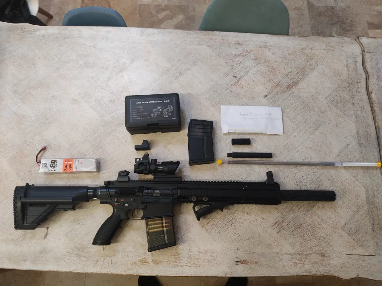 Il sera livré avec un chargeur lowcap, un hi-cap, le canon d'origine est donné, la batterie comme neuve, le ressort permettant d'être sous les 1 joules, un optique 4*32 avec RMR sur le dessus, la boîte d'origine avec le manuel, la housse de transport camo.