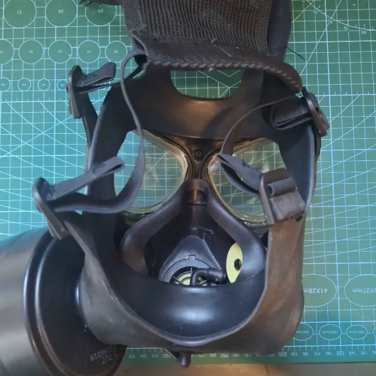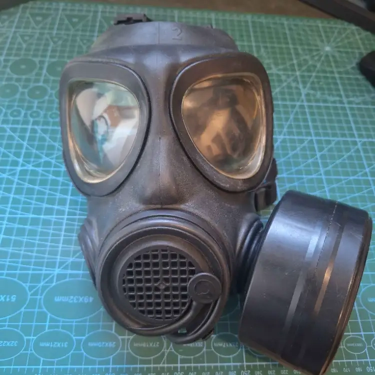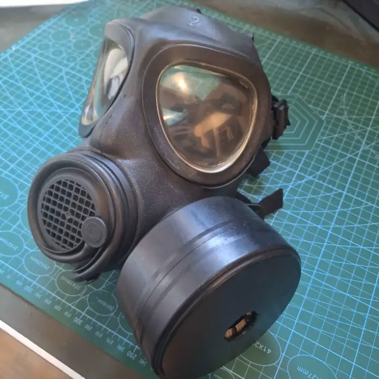 Masque à gaz Skyddsmask 90M très rare de l'armée suédoise, en version militaire (protection oculaire renforcée et tube pour boire). Taille 2 qui s'adapte à la majorité des gens.
