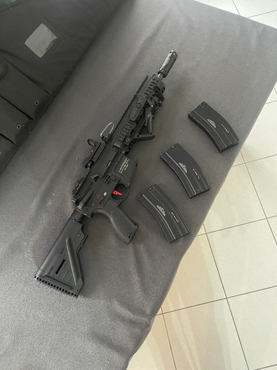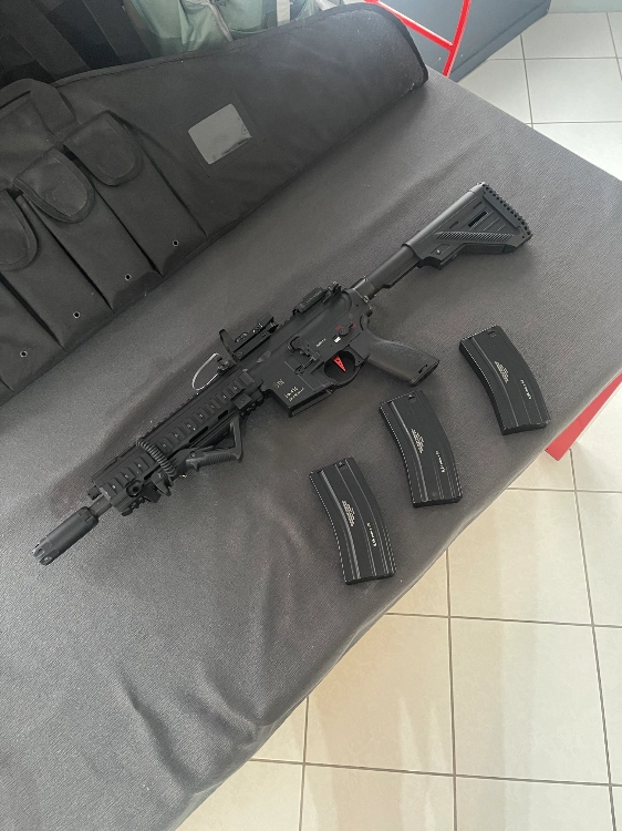 À vendre réplique hk416 umarex upgrade avec mosfet titan v2 avec canon est accessoire 4 chargeur viseur et traceur bifrost acetech je donne avec la housse de rangement