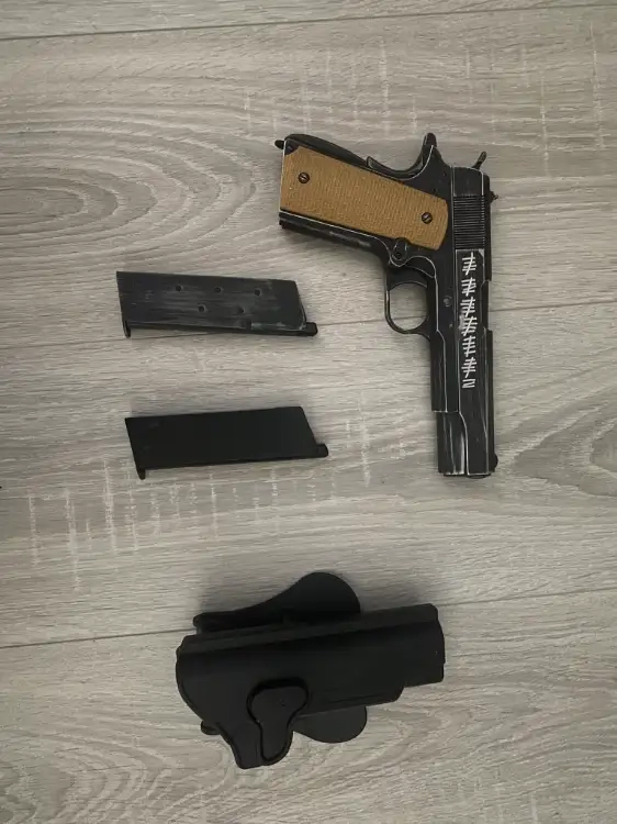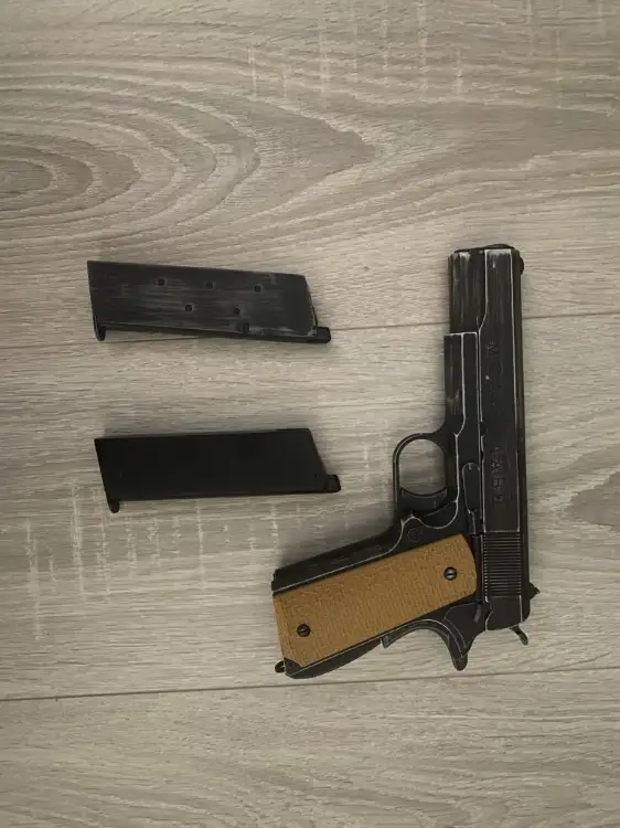 Il est vendu dans sa boîte d'origine avec 2 chargeurs, celui d'origine (effet usé) & un autre racheté à côté (noir), et un holster.