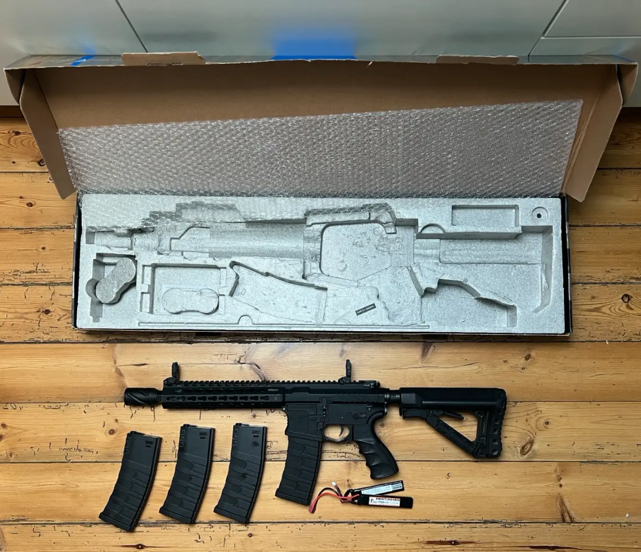 Vendu avec 4 chargeurs, une batterie 11.1, les mires et la boîte d'origine