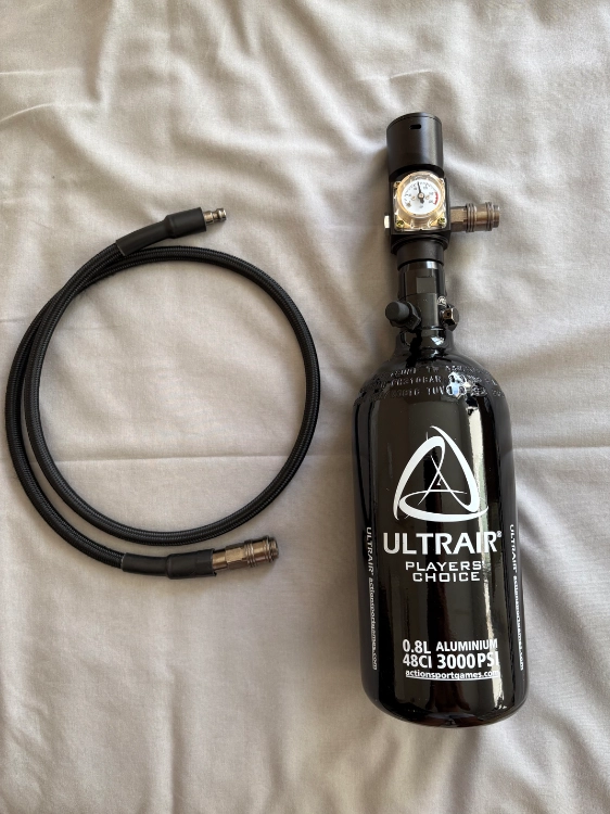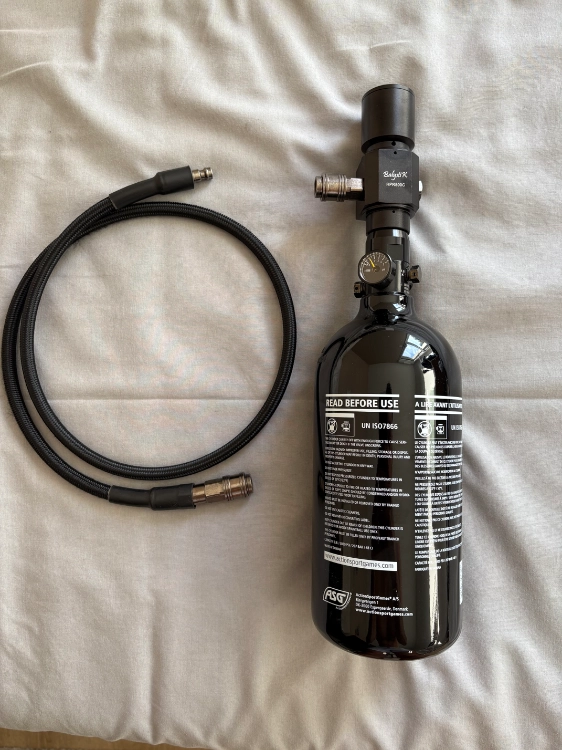 Une bouteille hpa de 0,8L avec régulateur Balystik et un flexible eu