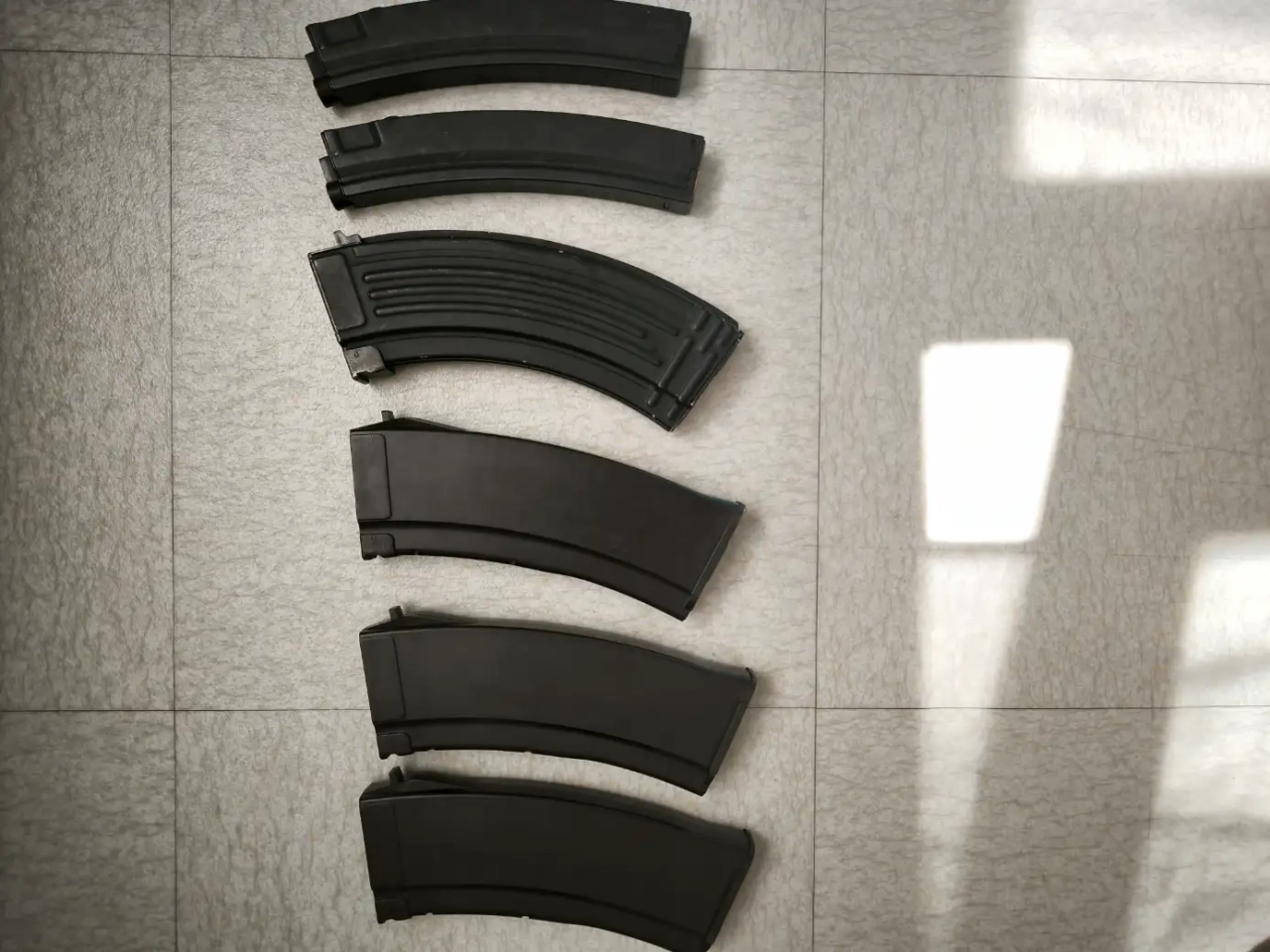Je vends des chargeurs de réplique airsoft AEG. 3 chargeurs bec à 74 en polymère couleur prune. Un chargeur type AK-47 en métal et deux chargeurs MP5.