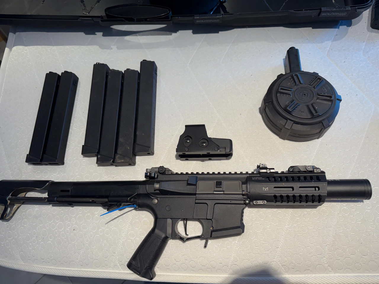 J’ai aussi un viseur dispo que j’offre, une malette sans la mousse un gilet, un tracer et des billes traçantes, une lampe que l’on peut accrocher sur les rails avec chargeur et un sac pour les lipos. Fourni sans batterie car les batteries n’ont pas été touché depuis 2 ans je ne préfère pas les donner.