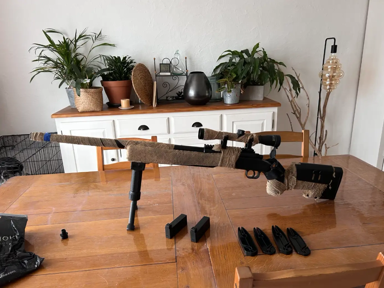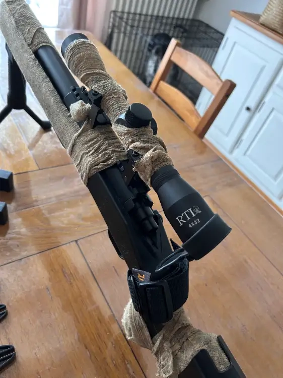 Vendu avec : La lunette 4x32, le ruban de camouflage, la sangle d'attache, 2 chargeurs, les différentes cal d'épaule et l'adaptateur de silencieux.