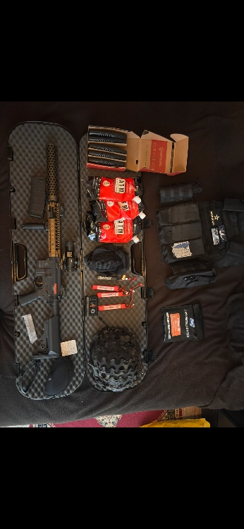 - Equipements : 6 chargeurs non métalliques, 3 sacs de billes, 4 batteries + chargeur, protège visage cagoule, lunette de protection, Casque avec camouflage, Chargeur bille, Gilet tactique.