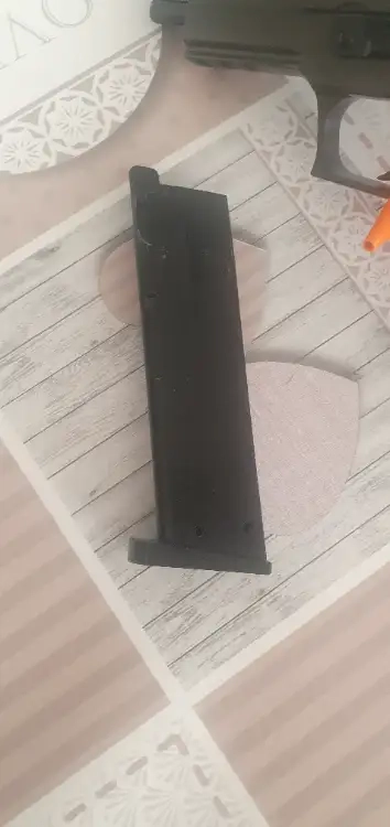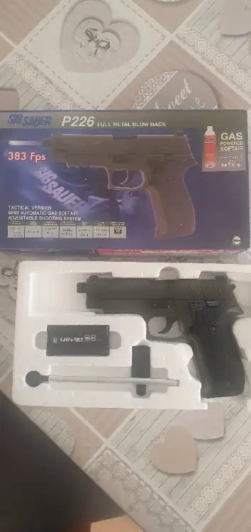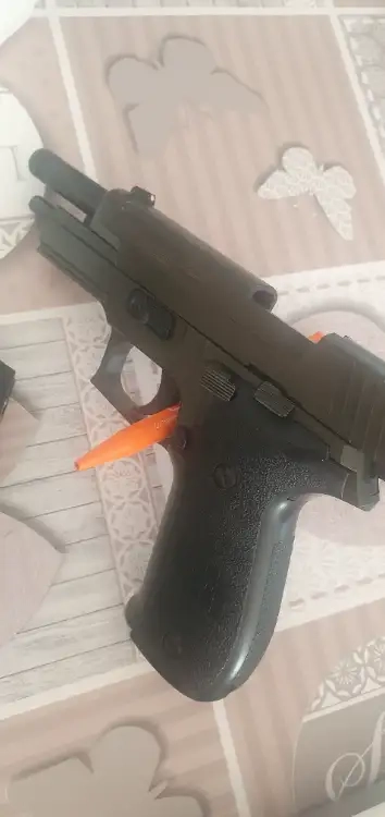 Sig sauer p226 en très bonne état et fonctionne parfaitement, livré avec son chargeur gaz fonctionnel, 1 sachet de billes, barre de debourage. Il est blowback donc culasse mobile et fais 383 fps et pèse 920 g.possible d adapté un silencieux grâce à son filetage en bout de canon