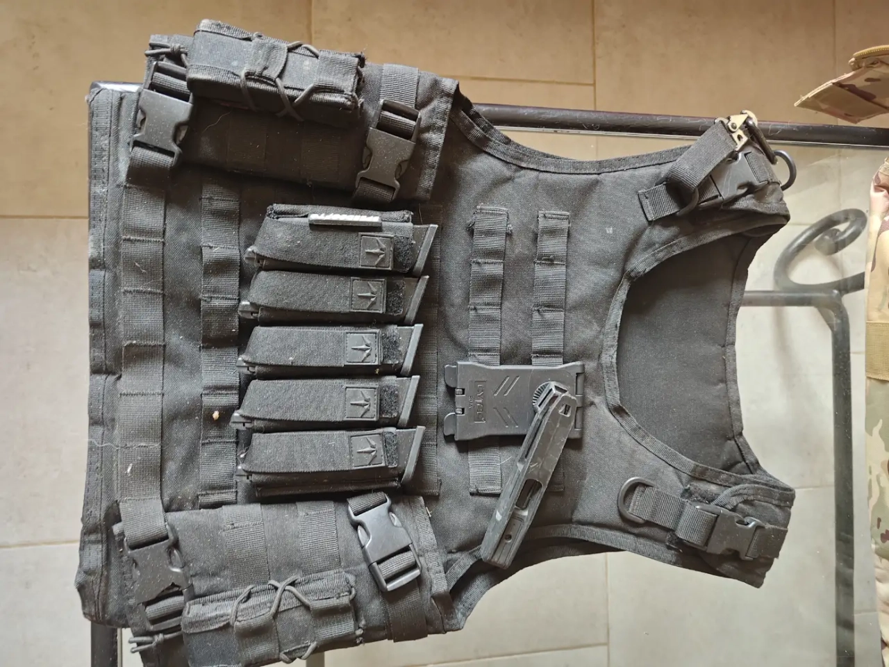 Gilet : Gilet tactique noir de type "Plate Carrier" avec système MOLLE.